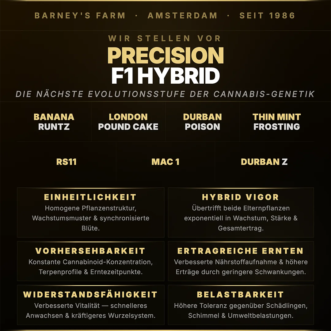 Bei Barney's Farm konzentrieren sich unsere wissenschaftlichen Zuchtprogramme auf die kontinuierliche Verbesserung der genetischen Qualität all unserer Sorten. Durch gezielte Selektion und Kreuzung verbessern wir beständig die Resistenz gegen Krankheiten und Schädlinge, während wir besonderen Wert auf die kontinuierliche Optimierung von Cannabinoid- und Terpenprofilen legen.