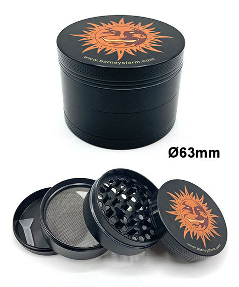 Barney's Farm Black Metal Grinder (4 Stück mit Maschensieb). Höhe 4,5 cm, Durchmesser 6,3 cm.